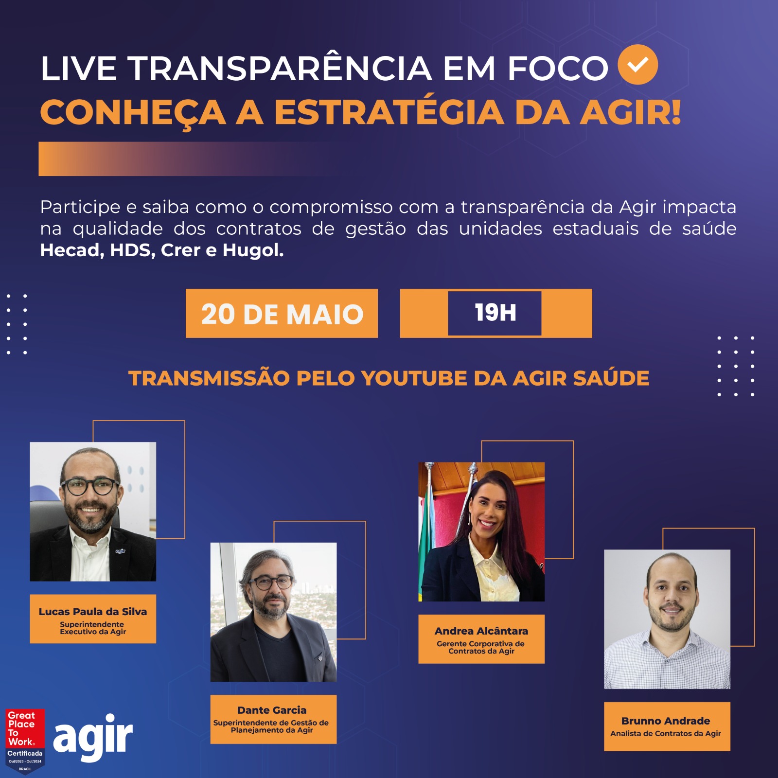 A live acontece às 19h com transmissão ao vivo pelo canal do Youtube da Agir, com a presença do superintendente executivo, Lucas Paula, o superintendente de gestão e planejamento, Dante Garcia, a gerente corporativa de contratos, Andrea Alcântara, e o analista de contratos, Brunno Andrade.