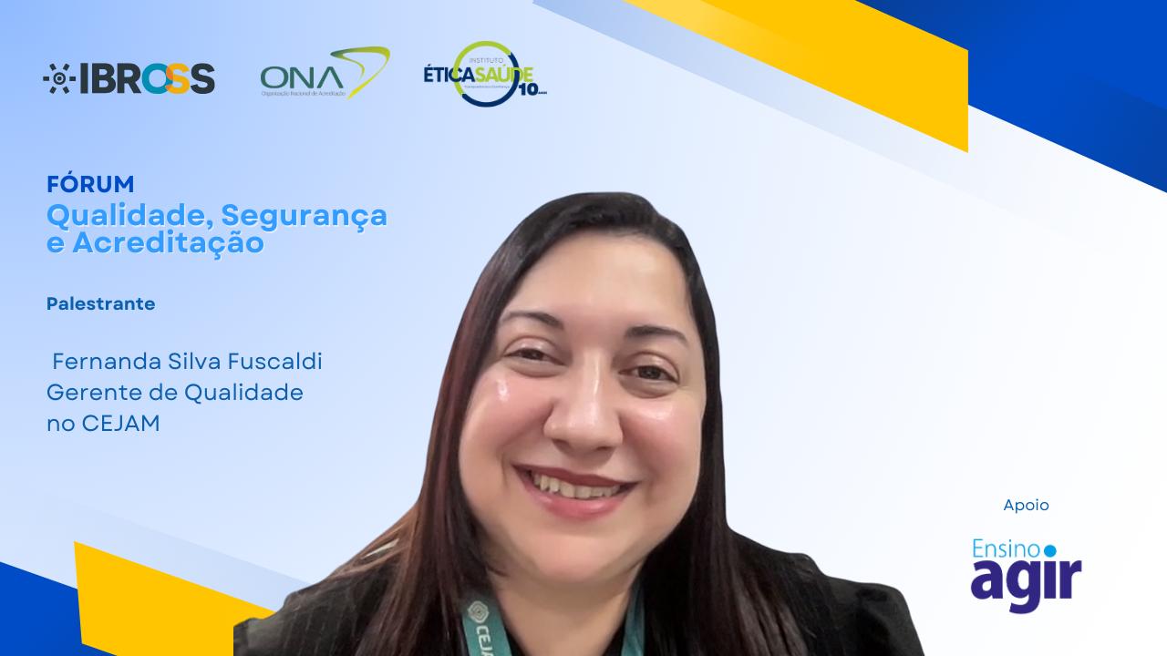 A palestrante convidada foi Fernanda Silva Fuscaldi, gerente de Qualidade no CEJAM, que compartilhou experiências acumuladas ao longo de 15 anos de atuação em gestão da qualidade, abordando os desafios, ganhos e transformações culturais vivenciados por organizações que trilham o caminho da acreditação. Conduzido pelo moderador J. Antônio Cirino, o diálogo reforçou a importância da construção de sistemas confiáveis, equipes preparadas, decisões baseadas em evidências e melhoria contínua para gerar impacto assistencial.