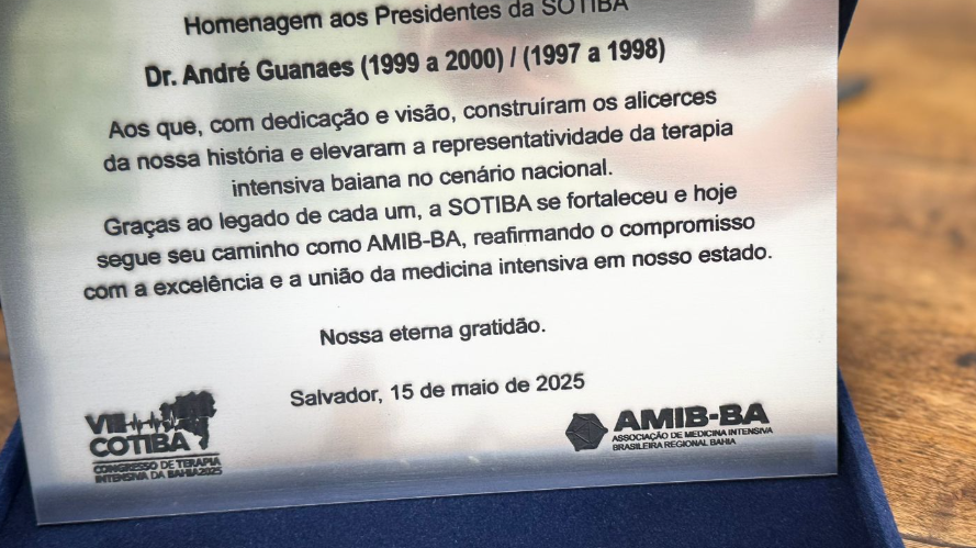 O Diretor-Presidente do Instituto Sócrates Guanaes (ISG, associado Ibross), Dr. André Guanaes, foi homenageado nesta sexta-feira, 16 de maio, durante a VIII edição do Congresso de Terapia Intensiva da Bahia – COTIBA 2025, promovido pela Associação de Medicina Intensiva Brasileira – regional Bahia (AMIB-BA).