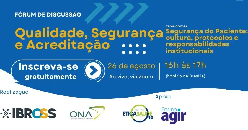 Em conjunto com a Organização Nacional de Acreditação (ONA) e o Instituto Ética Saúde (IES), e apoiado pelo Ensino Agir, o Ibross realiza nesta terça-feira (26), entre 16h e 17h, um evento voltado a debater segurança do paciente, um dos pilares essenciais para a excelência no setor. Nesta segunda edição será discutido os desafios e caminhos para consolidar uma cultura institucional de segurança, abordando a importância de se seguir protocolos bem estruturados, refletindo sobre as responsabilidades das organizações e equipes da área.