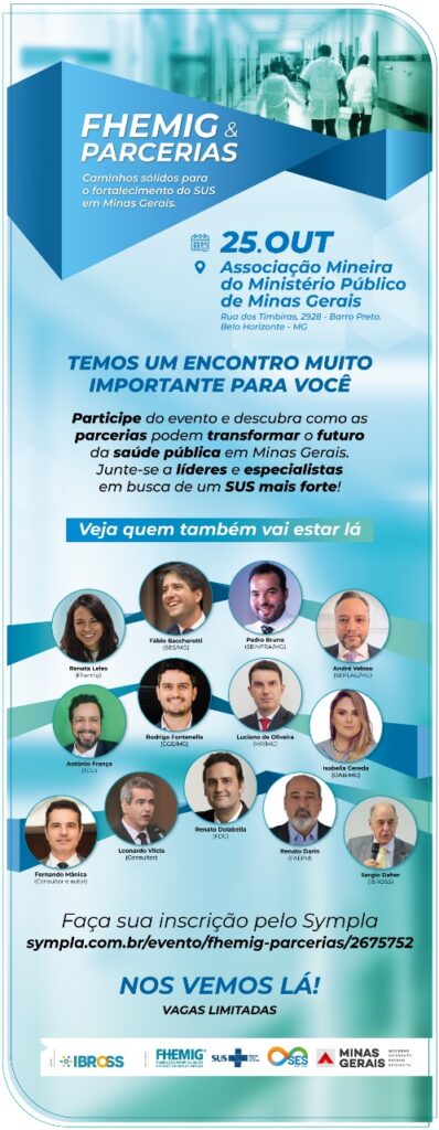 A Fundação Hospitalar do Estado de Minas Gerais (Fhemig), associada Ibross, irá promover um evento de debate de ideias sobre soluções em gestão para o Sistema Único de Saúde (SUS) sob o tema “Caminhos sólidos para o fortalecimento do SUS em Minas Gerais”. O encontro ocorrerá no próxima dia 25.10, sexta-feira, em Belo Horizonte, na Associação Mineira do Ministério Público de Minas Gerais, localizada à Rua dos Timbiras, Nº 2928 – Barro Preto. A reunião conta com o apoio do Governo do Estado de Minas Gerais.
