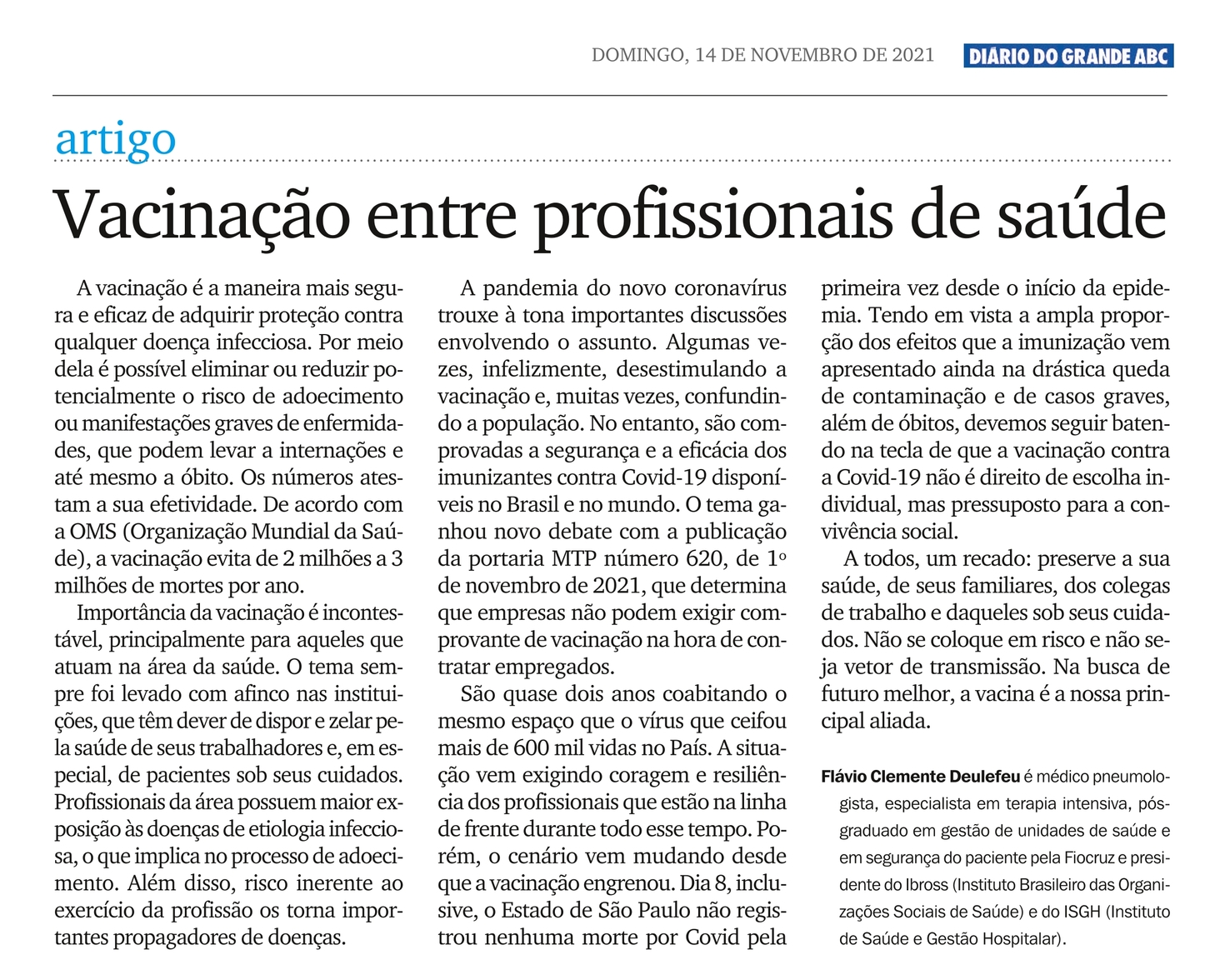 Em artigo publicado no jornal Diário do Grande ABC, o presidente do Ibross, Flávio Clemente Deulefeu, fala sobre a importância da imunização contra a covid-19, especialmente, para profissionais de saúde.