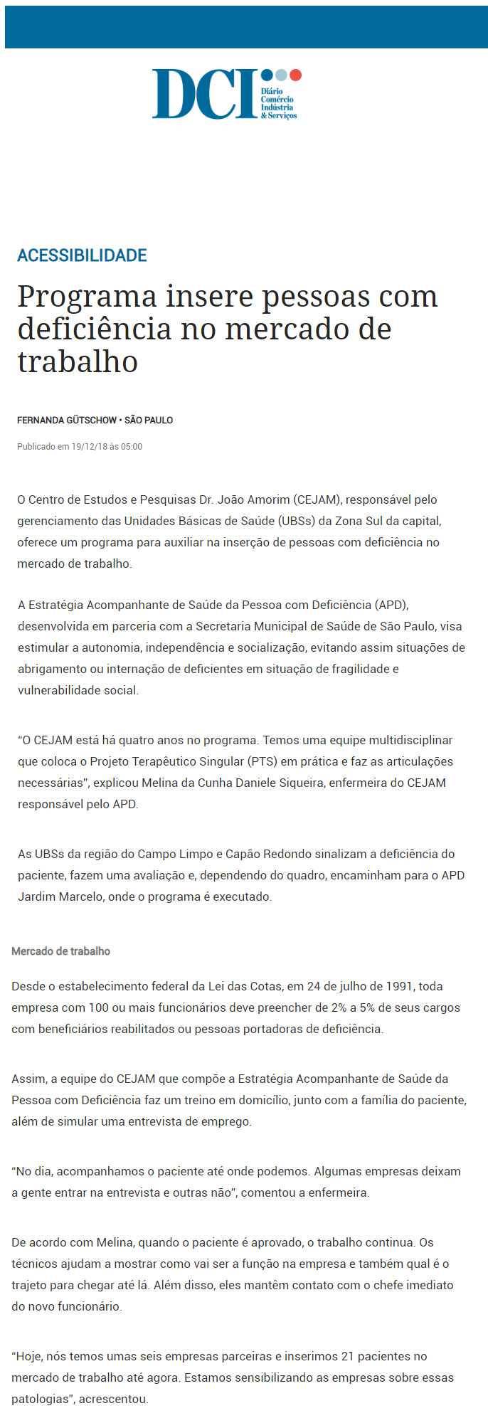 Reportagem publicada no jornal Diário Comércio Indústria e Serviços (DCI), na última quarta-feira (19/12), destacou o programa Estratégia Acompanhante de Saúde da Pessoa com Deficiência (APD), desenvolvido pelo Centro de Estudos e Pesquisas Dr. João Amorim (CEJAM) – associado Ibross – em parceria com a Secretaria Municipal de Saúde de São Paulo.