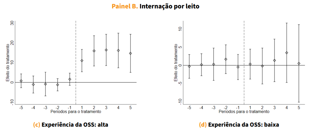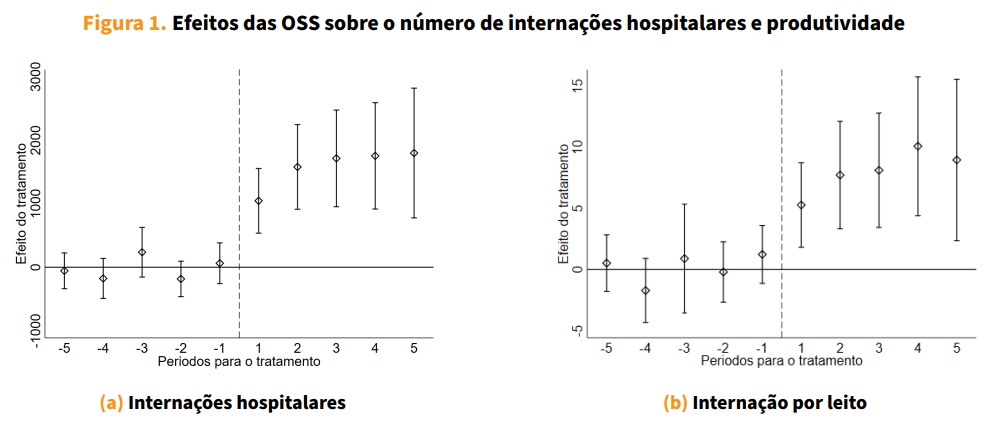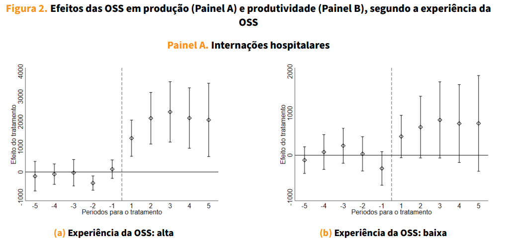 A adoção do modelo OSS leva a um aumento expressivo de internações hospitalares, da ordem de 40% em relação ao período pré-transição. Esse efeito é consistente entre diferentes tipos de atendimento (como clínico e cirúrgico) e entre condições mais ou menos urgentes. A Figura 1 (painel a) mostra que esse aumento de produção se consolida progressivamente ao longo dos anos após a transição.