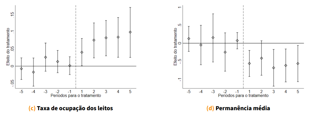 Além disso, observamos melhorias significativas na produtividade hospitalar. A rotatividade de leitos aumenta em 23% e a taxa de ocupação cresce 14%, ao passo que o tempo médio de permanência é reduzido. Esses resultados, apresentados nos painéis (b), (c) e (d) da Figura 1, sugerem ganhos operacionais relevantes que não se devem à ampliação da capacidade instalada, mas sim ao uso mais eficiente dos recursos já existentes.
