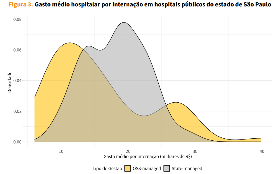 Fonte: A figura apresenta a distribuição do gasto hospitalar por internação em 18 hospitais públicos do estado de São Paulo, categorizados segundo o tipo de gestão (OSS ou direta pelo governo), no período de 2013 a 2022. A amostra inclui hospitais com 100 a 200 leitos, comparáveis em porte aos analisados no estudo principal. Os dados de hospitais OSS foram obtidos no Portal da Transparência do Estado de São Paulo, enquanto os dados de hospitais estatais foram extraídos da Secretaria da Fazenda e Planejamento. Os valores incluem gastos operacionais (como recursos humanos, materiais e medicamentos) e investimentos em equipamentos e mobiliário — excluindo custos de expansão de leitos —, e foram ajustados para valores de dezembro de 2022 com base no IPCA/IBGE. Nos hospitais OSS, os valores correspondem integralmente aos contratos de gestão firmados com o governo.