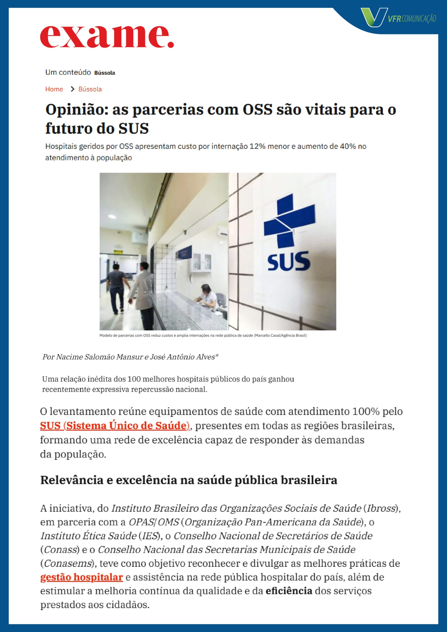 No início de abril, foi publicado o artigo assinado pelo presidente do Instituto, doutor Nacime Mansur e vice-presidente do Ibross José Antônio Alves, que realça a importância das parcerias entre Organizações Sociais da Saúde e o SUS para a entrega de um serviço de qualidade para a população.