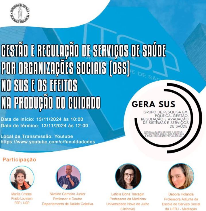 No dia 13 de novembro, das 10h às 12h, a Faculdade de Saúde Pública da USP promove o webinar “Gestão e Regulação de Serviços de Saúde por Organizações Sociais (OSS) no SUS e os efeitos na produção do cuidado”. O evento será online, transmitido pelo canal da FSP-USP no YouTube.